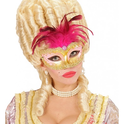Zlatá škraboška s růžovým dekorem, peřím a kamínkem Materiál: 90% PVC, 10% peří