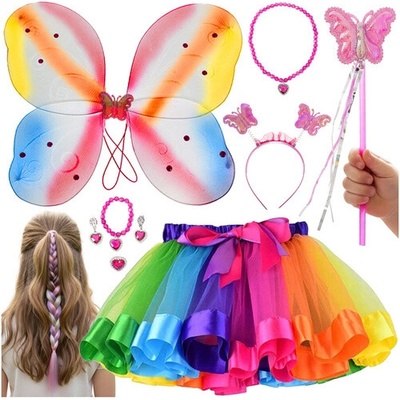 Dětský barevný kostým motýla s křídly, čelenkou, sukní a dalšími doplňky. Bude se skvěle hodit na karneval, maškarní ples nebo halloweenskou párty. Obsah sady: motýlí křídla...