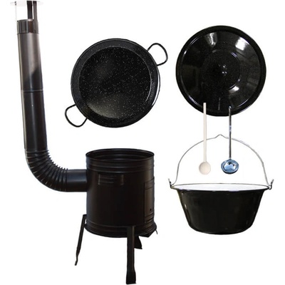 Souprava obsahuje Paella smaltovanú pánev průměr 34 cm, smaltovaný kotlík objem 10 L (1,2 mm), kotlinu s průměrem 31 cm, smaltovanú poklicu, nerezovú naběračku, vařečku