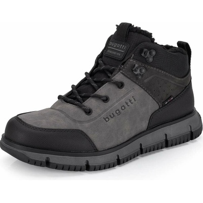 Pánské kotníkové boty Bugatti na pohodlné platformě. Kombinace černé podešve vzoru s šedým vzorem zaujme na první pohled. Díky zipu po straně se dobře obouvají....