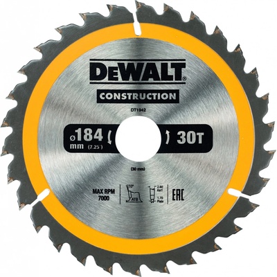 DEWALT kotoučová pila 184/30 mm 30WZ DT1942-QZ Technické údaje:Počet zubů: 30Tvar zubů: WZPrůměr: 184 mmŠířka řezu: 2,6 mmVrtání: 30 mmÚhel zubů: 10° Upozornění: Dekorace nejsou...