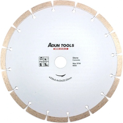 Diamantový řezný kotouč ADUN TOOLS kvalitní zpracování a dlouhá životnost řezání za sucha i mokra průměr 230 mm tloušťka 2.4 mm šířka pracovní plochy 10 mm středová díra 22.23...