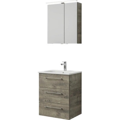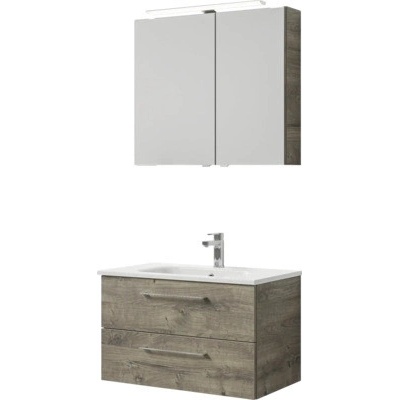 Závěsná koupelnová sestava s keramickým umyvadlem v dekoru akácie s fóliovaným povrchem. S plnovýsuvem a dotahem.