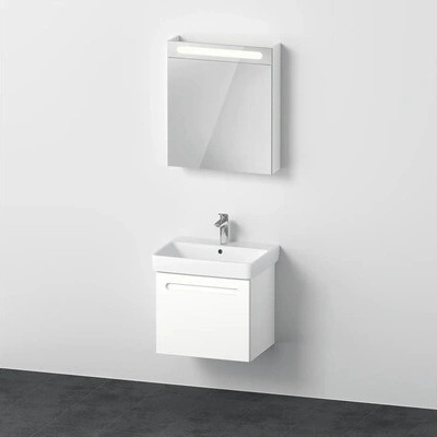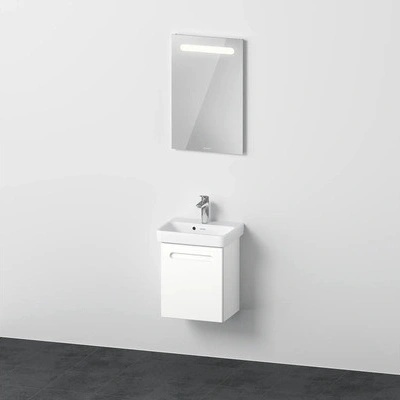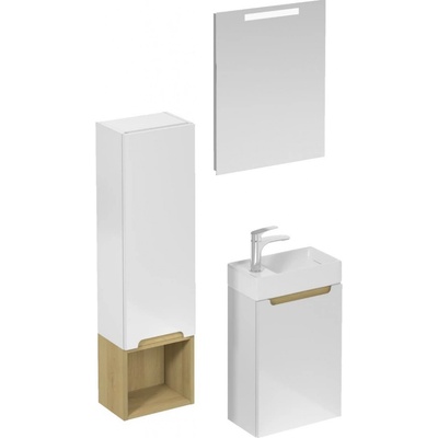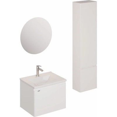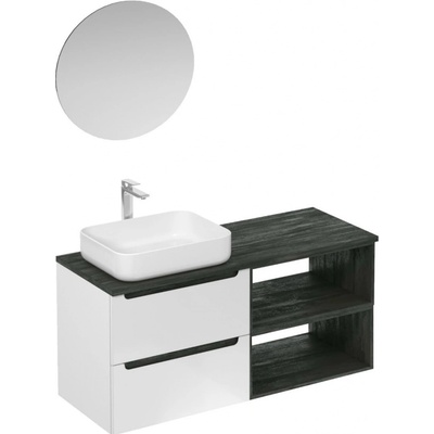 Závěsná koupelnová sestava s keramickým umyvadlem v bílé barvě s lesklým povrchem s fóliovaným povrchem. S plnovýsuvem a dotahem.