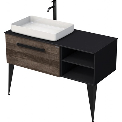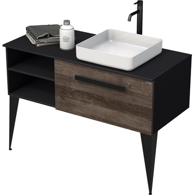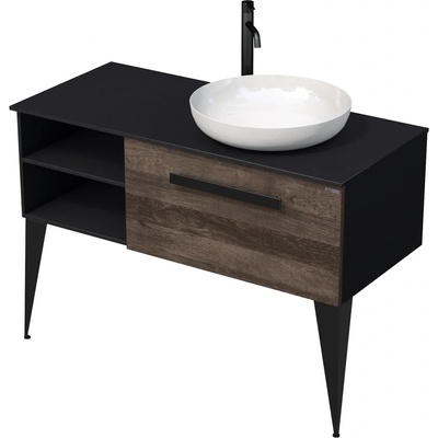 Závěsná skříňka s deskou 110 cm v kombinaci dekoru černé břidlice a lesklého tmavého dřeva, pro obdélníkové umyvadlové mísy Kaldewei Miena. Deska s výřezem pro umístění umyvadla...