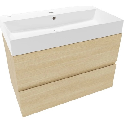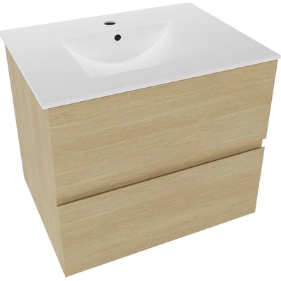 Závěsná koupelnová skříňka s keramickým umyvadlem v dekoru světlé dřevo s matným povrchem o rozměru 80x50x45,5 cm. Povrch v provedení lamino.