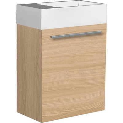 Skříňka s umyvadlem ve světlém dřevě o šíři 40 cm a hloubce 22cm, vhodné pro WC nebo malé prostory. Univerzální verze levá/pravá, otočením umyvadla nebo dvířek.
