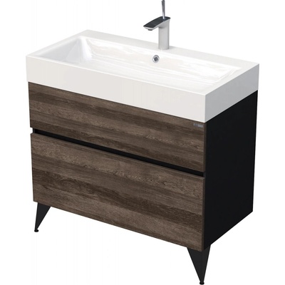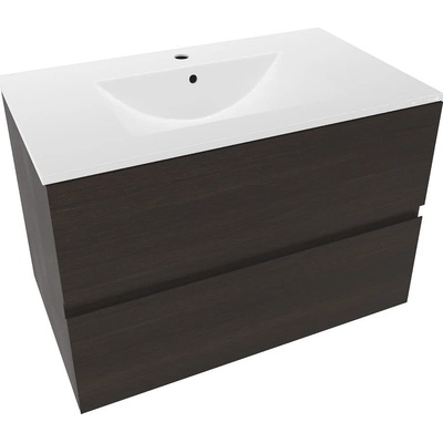 Závěsná koupelnová skříňka s keramickým umyvadlem v barevném provedení tmavé dřevo s matným povrchem o rozměru 80x50x45,5 cm. Povrch v provedení lamino.