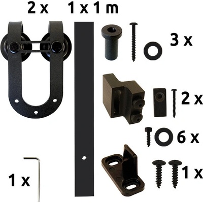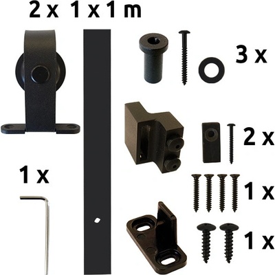 Kování na nábytek. Materiál: ocel. Barva: černá matná. Obsah balení: kolejnice 1000x25x4 mm - 1ks, vozík - 2ks, doraz - 2ks, spodní vedení - 1ks, spojovací a kotvící materiál....