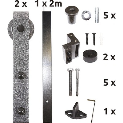 Materiál: ocel. Barva: černá. Obsah balení: kolejnice 200 cm - 1ks, vozík - 2ks, doraz - 2ks, spodní vedení - 1ks, spojovací a kotevní materiál. Distanční váleček / vzdálenost...