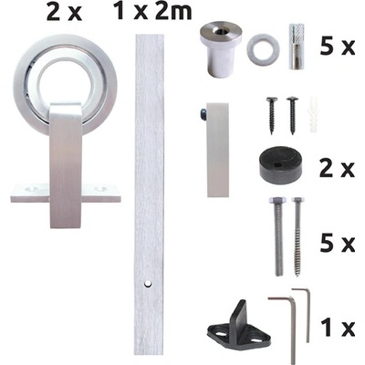 Materiál: nerez. Obsah balení: kolejnice 200 cm - 1ks, vozík - 2ks, doraz - 2ks, spodní vedení - 1ks, spojovací a kotvící materiál. Nosnost: 100kg.