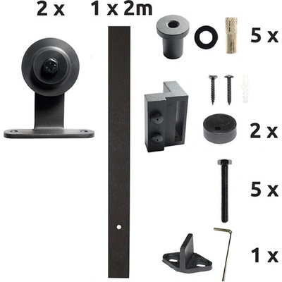 Rozměr kování: 120 x 115 mm, Materiál: ocel. Barva: černá matná. Obsah balení: kolejnice 200 cm - 1ks, vozík - 2ks, doraz - 2ks, spodní vedení - 1ks, spojovací a kotvící...