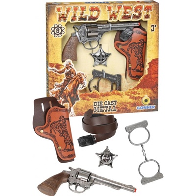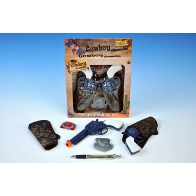 Kovbojská sada obsahuje kožené pouzdro, opasek, šerifskou hvězdu, pouta a stříbrný bohatě gravírovaný revolver.