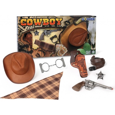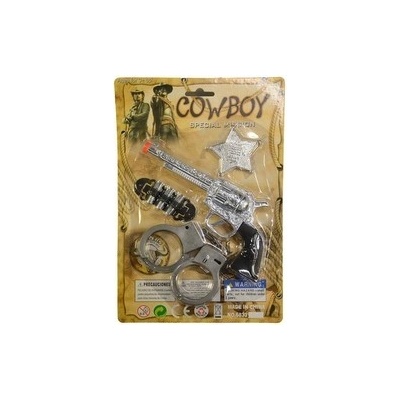 Souprava kovbojská\nHračka je určena pro děti 3+.\nRozměr hračky je 28x18cm.\nMateriál hračky je plast.\nBalení hračky je blister card.