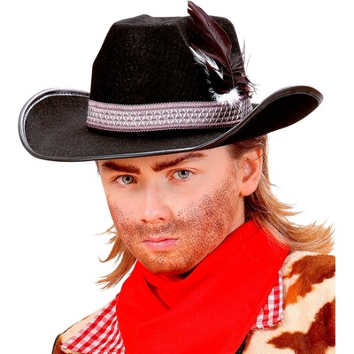 Dětský kovbojský klobouk s peřím – černý Filcový pevný dětský klobouk Cowboy s peřím od společnosti Widmann. Prvotřídní filcový materiál, obšité lemy, zdoben přírodním peřím....