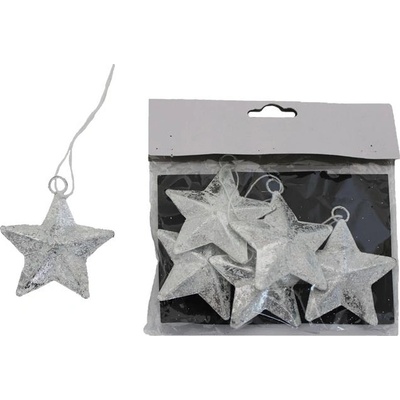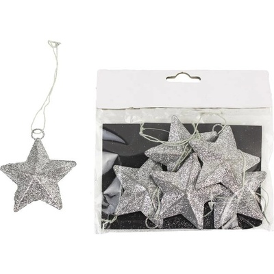 Sada dekoračních hvězdiček k zavěšení. Sada obsahuje 6 hvězdiček. Rozměry: 6,5 x 6,5 x 1,5 cm. Materiál: kov. Barva: stříbrná. Tento výrobek není hračka. Plastový obal...