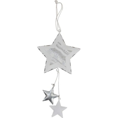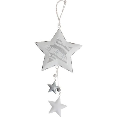 Kovová hvězda k zavěšení velká. Rozměry: 15 x 1,5 x 38 / 15 cm. Materiál: kov. Barva: bílá, šedá. Tento výrobek není hračka. Určeno do vnitřních prostor.