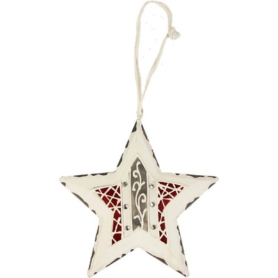Krásná dekorační hvězda k zavěšení. Rozměry: 10 x 10 x 1,3 cm. Materiál: kov. Barva: bílá, červená. Tento výrobek není hračka. Určeno do vnitřních prostor.