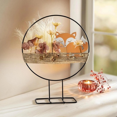Stylová podzimní dekorace ve tvaru kruhu na podstavci – její přirozenou eleganci podtrhuje pruh z provázku, do něhož jsou zasunuty jemné detaily: silueta lišky, pírka a textilní...