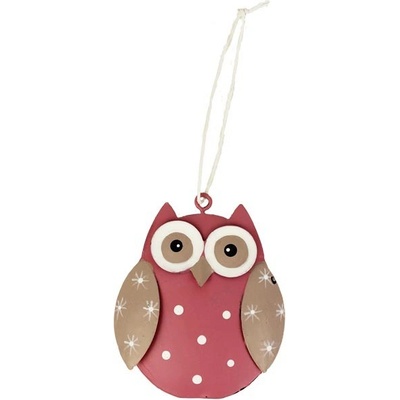 Dekorativní sovička k zavěšení. Rozměry: 7 x 1,5 x 7,5 cm. Materiál: kov. Barva: růžová, hnědá. Tento výrobek není hračka. Určeno do vnitřních prostor.