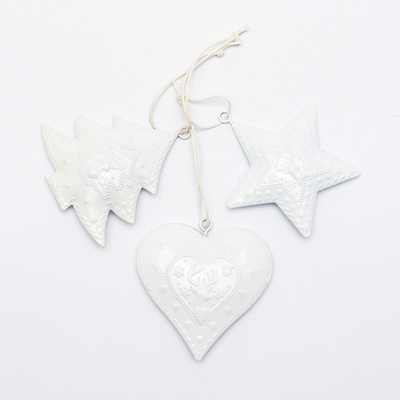 Sada 3 kovových ozdob, strom, hvězda a srdce.