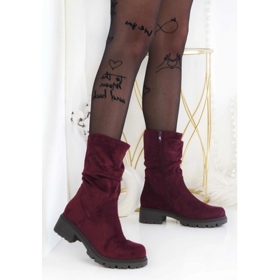 Vínové kozačky Typ zapínání: zip Podrážka: hrubý vzorek Zateplení: kožíšek Materiál: Svršek: syntetická semišová kůže, Podšívka: textil, Podešev: syntetika Výška boty: 24 cm (bez podpatku) Podpatek: 4,5 cm Šířka přes lýtko: 32 cm