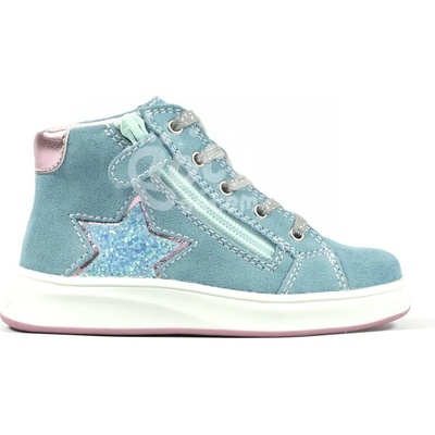 Vysoké tenisky z hladké kůže a efektního materiálu se šněrováním a zipem. Dívčí luxusní kožená obuv z velmi jemné a prodyšné kůže se sametovým povrchem a lesklou aplikací....