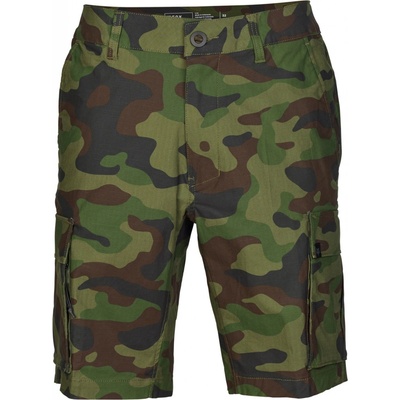 Kraťasy ve Fox Camo vzoru s elastickým pasem s očky pro opasek.Zip v rozkroku 6 kapes - 2 zadní, 2 přední, 2 kapsy na nohou s rychlozapínáním 98% bavlna, 2% elastan
