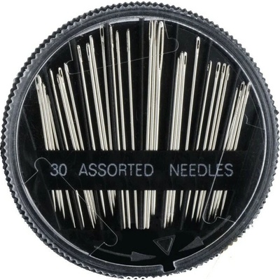Sada 30 jehel na ruční šití různé velikosti Sada krejčovských jehel v praktické plastové krabičce. Souprava obsahuje 30 kusů jehel se stříbrnými uchy pro bezproblémové navlečení...