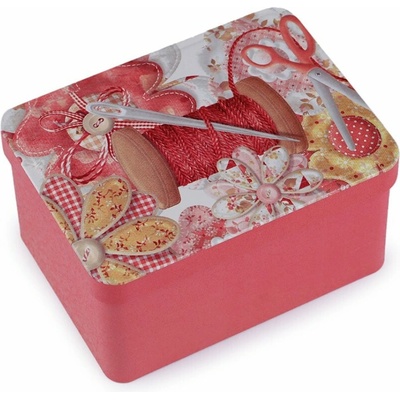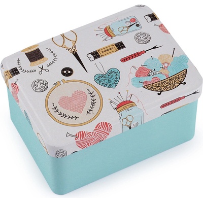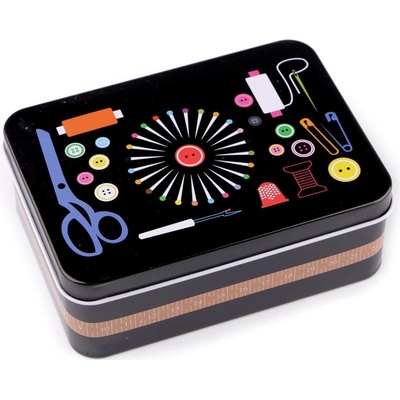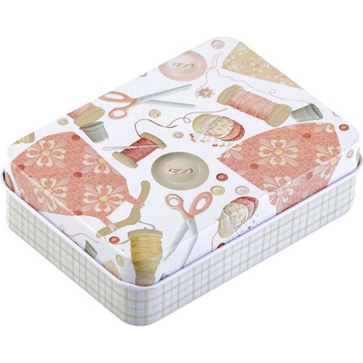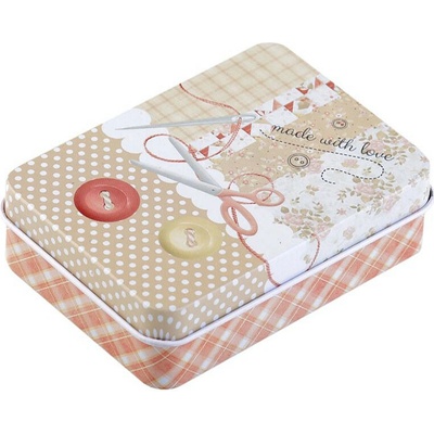 Malá plechová krabička je vhodná na drobnosti. Její švadlenkovský design ji předurčuje na uložení šicích potřeb jako jsou knoflíky, jehly, nitě, krejčovské metry, zkrátka všechny drobnosti, které k šití potřebujete. Víko lze sundat. - Rozměry: č. 1: 10 x 14 x 5,3 cm
