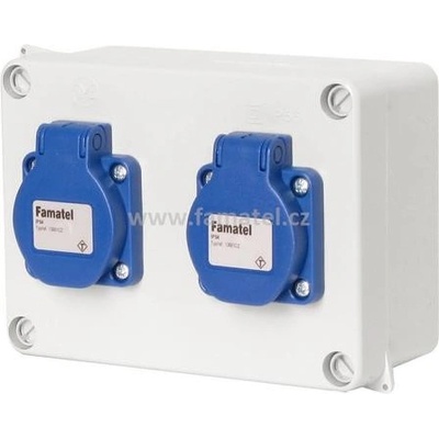 Krabice 3064 IP54 2x230V s ochr. kolíkem, 160x120x73mm, hladké boky. Nachystáno na 1.fázové připojení pomocí šroubových svorek.
