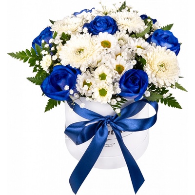 Bílá luxusní krabice plná modrých růží a chryzantém Krabičky růží jsou v poslední době trendy dárek. Frutiko nabízí nové originální pojetí. Modré růže v kombinaci s...