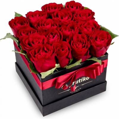 Černá hranatá krabice rudých růží 16 ks