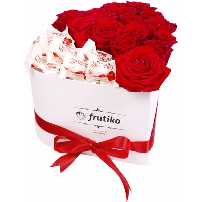 Bílá krabice ve tvaru srdce s rudými růžemi Raffaello. Romantické rudé růže jsme zasadili do luxusní bílé srdcové krabice a doplnili jemnými kokosovými bonbony Raffaello....