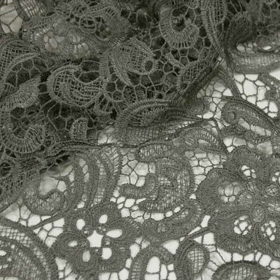 Šedá krajka se vzorem květů a lístků. Zpracování krajky umožňuje vystřihnout motiv například v oblasti dekoltu nebo použít části jednotlivých motivů krajky k aplikaci na jiný...