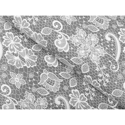 100% bavlněné plátno se vzorem bílé krajky na šedém podkladu. I přes svou jemnost je látka dostatečně pevná a po vyprání drží tvar a barevnost, také oceníte její přirozenou...