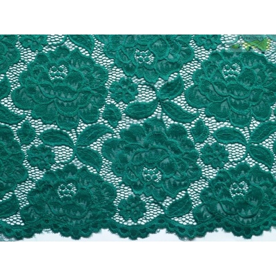 Tato tmavě zelená elastická krajka s květovaným vzorem má oboustranné ozdobné zakončení. Při využití tohoto zakončení, je nutné stříhat po obvodu. Je nutné podšití krajky. Je...