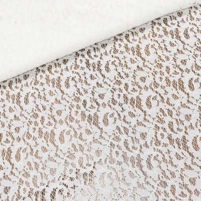 Látka, elastická krajka v bílé barvě. Krajka je v šířce 140 cm a je vyrobena z 50% nylonu a 50% viskózy. Látka je vhodná na plesové a společenské halenky, topy, šaty a sukně.
