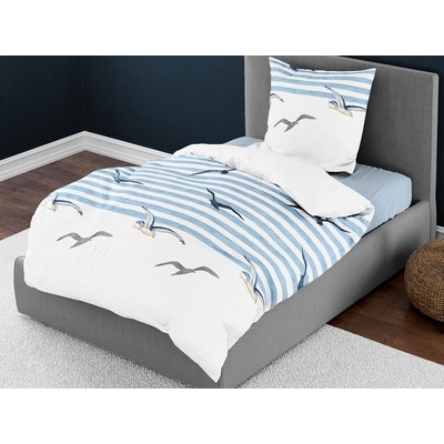 Krepové povlečení s mořským motivem - modré pruhy a rackové. Povlečení z bavlněného krepu si zachovává vlastnosti klasického bavlněného povlečení, má ale jednu nespornou výhodu...