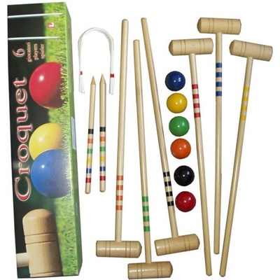 Dřevěný kroket pro 6 hráčů, obsahuje šest palic, deset branek, šest koulí a dva kolíky. Dřevěné doplňky jsou barevně rozlišené. Zahradní kroket je ideální hra na výlet s rodinou. Účelem hry je dostat míček pomocí paličky skrz všechny branky. Vyhrává ten, kdo má nejméně...