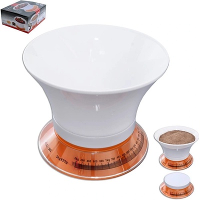 Mechanická kuchyňská váha s odnímatelnou plastovou miskou s výlevkou vám pomůže při pečení, vaření, zavařování... Váživost 3 kg, 1 dílek = 25 g. Stupnice v kg/g a v lbs/oz,...
