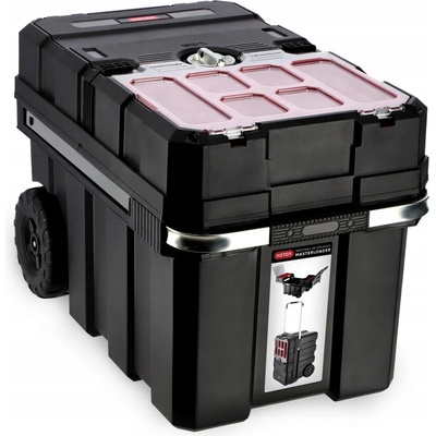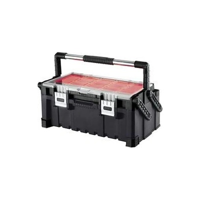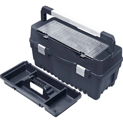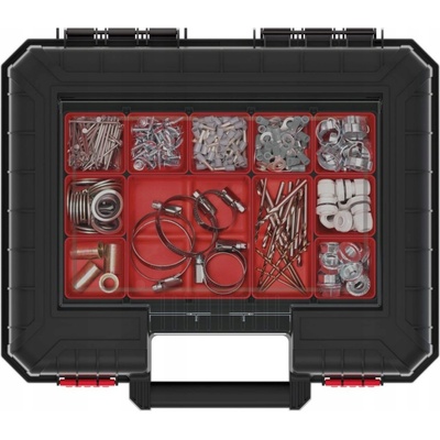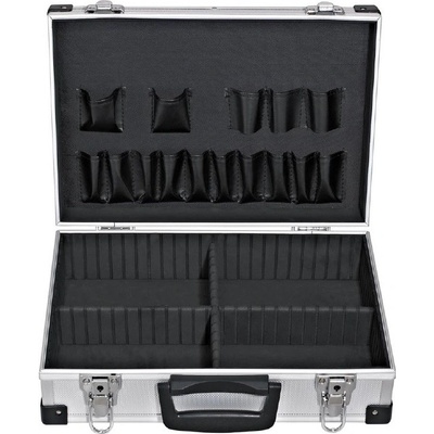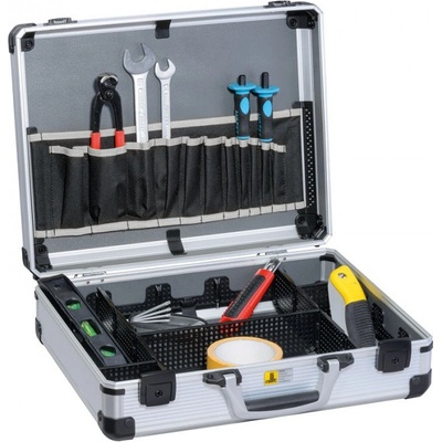 Odolný plastový kufr s hliníkovým rámem. Vhodný zejména na nářadí a montážní materiál. Variabilní plastové přihrádky a textilní kapsy v horním víku kufru. Uzavíratelný pomocí...