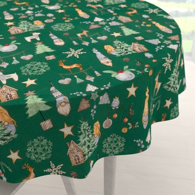 Bavlněný kulatý dekorační ubrus na stůl s vánočním vzorem vánočních skřítků a ozdob na zeleném podkladu. Je ušitý z hustě tkaného 100% bavlněného plátna s certifikátem zdravotní...