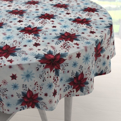 Dekorační saténový kulatý ubrus na jídelní stůl s digitálním tiskem, se vzorem červených vánočních hvězd a vloček na ledově modrém podkladu, ušitý ze 100% polyesterové...