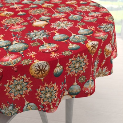 Bavlněný kulatý dekorační ubrus na stůl s vánočním vzorem baněk na červeném podkladu. Je ušitý z hustě tkaného 100% bavlněného plátna s certifikátem zdravotní nezávadnosti...