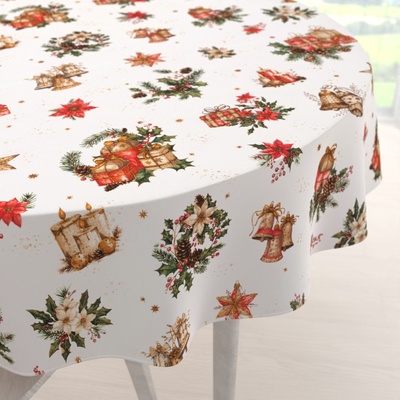 Bavlněný kulatý dekorační ubrus na stůl s vánočním vzorem vánočních hvězd a ozdob na bílém podkladu. Je ušitý z hustě tkaného 100% bavlněného plátna s certifikátem zdravotní...