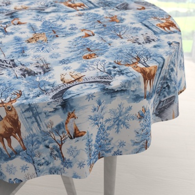 Bavlněný kulatý dekorační ubrus na stůl se vzorem lesních zvířat v zimním lese na modrém podkladu. Je ušitý z hustě tkaného 100% bavlněného plátna s certifikátem zdravotní...
