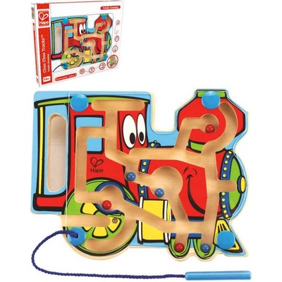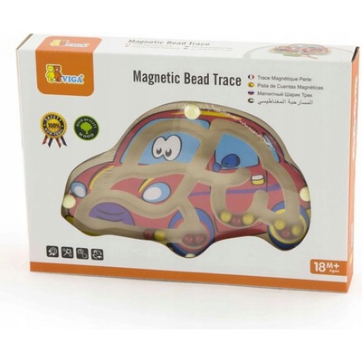 Dřevěný magnetický labyrint s kuličkami ve tvaru auta. Rozměry cca 18,5 x 11 cm. Rozměry balení cca 22,5 x 16,5 x 4 cm. Věk 18m+