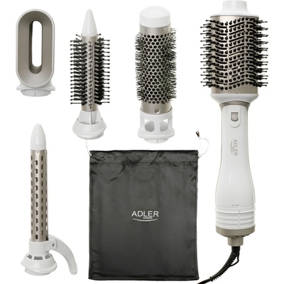 Horkovzdušný kartáč, příkon 1200 W, funkce studeného vzduchu, 5 vyměnitelných nástavců: kulatý kartáč o průměru 21, 38 a 72 mm, kulma o průměru 19 mm, fén, otočný napájecí kabel...