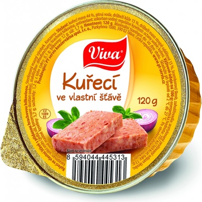 Viva Kuřecí ve vlastní šťávě 120g. Složení: Kuřecí maso 44 %, pitná voda, drůbeží maso strojově oddělené 15 %, drůbeží kůže 15 %, bramborový škrob, zahušťovadla: acetylovaný...
